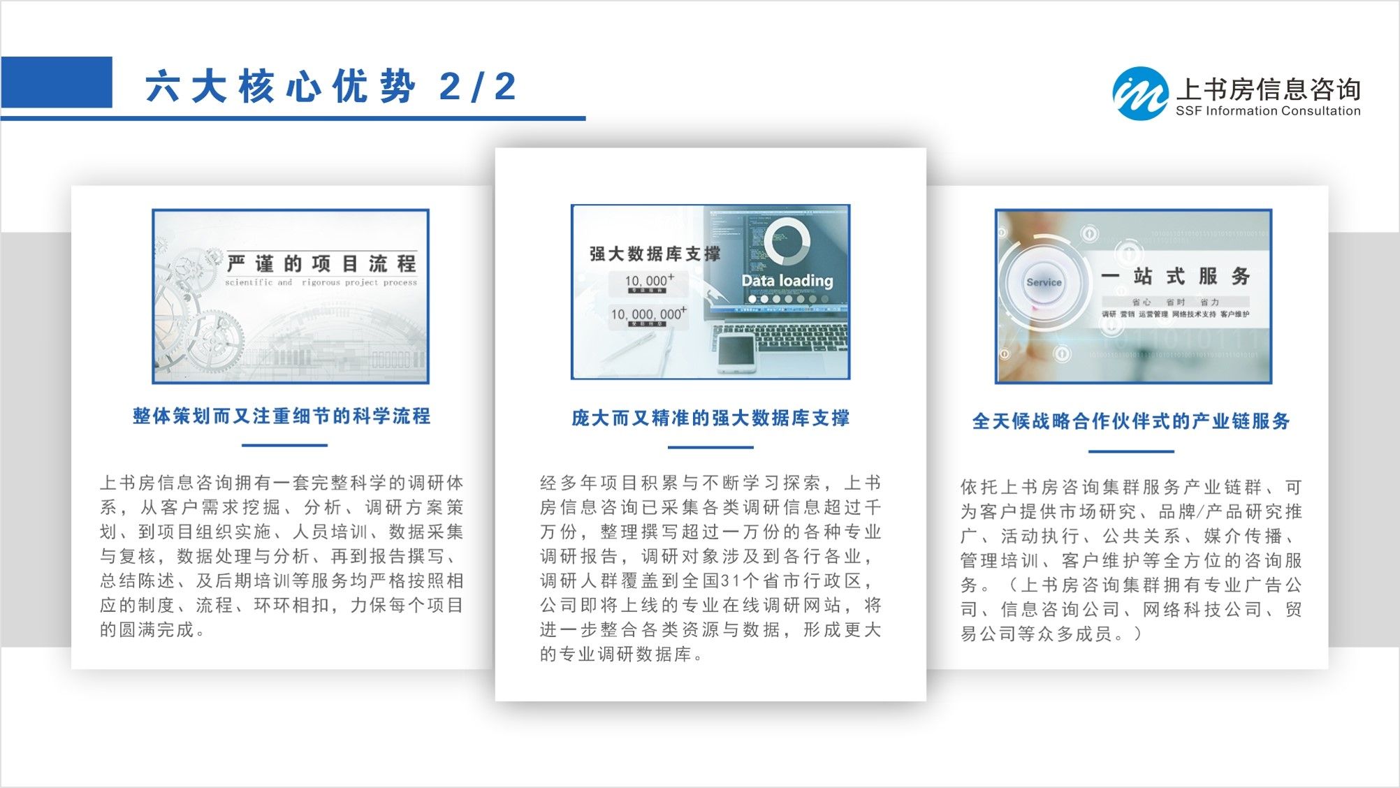 上书房信息咨询媒体研究中心提供商业地产、餐饮食品、教育旅游、通讯数码、医疗美容、汽车金融和家电产品等行业研究,服务过星河、世贸、仁恒、颐安、港中旅、绿景、远洋、香港永南食品、嘉旺、埃克斯、乐高教育、深圳市消协、联通、南方都市、世为投资、酷派、爱帝宫、美莱医院、安莉芳、斯巴鲁、平安保险等客户。